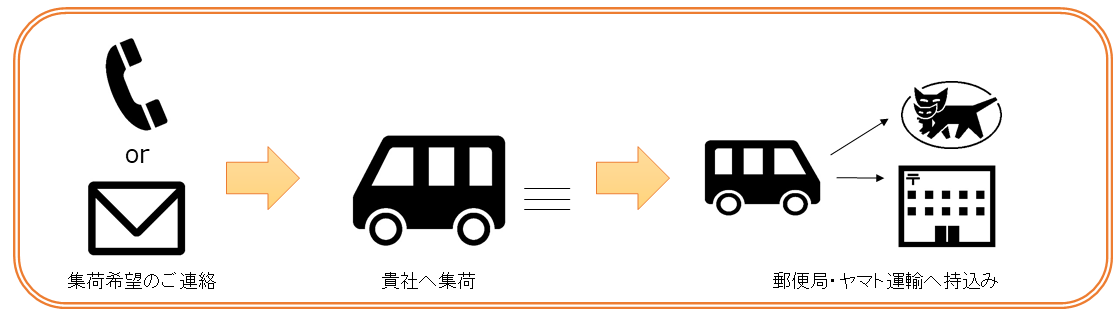 - ご提案のち、決定しましたスケジュール通りにお伺いし、集荷し、郵便局・ヤマト運輸に差出を行います。